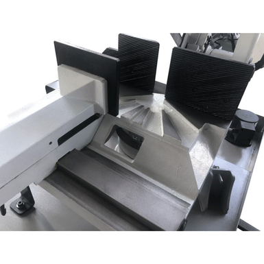 Sega a nastro Thomas ZIP 32 manuale per taglio materiali ferrosi, 0° a 60° dx, 0° a 45° sx, tramite spostamento laterale della morsa, doppia velocità di taglio, morsa con leva bloccaggio rapido, elettropompa liquido refrigerante, fermo barra per misurazione lunghezza di taglio