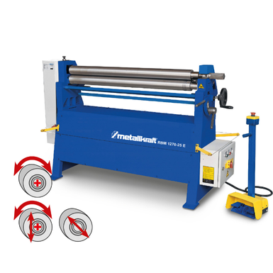 Calandra motorizzata 3 rulli con avanzamento elettronico, costruzione in ghisa, curvatura conica, rullo superiore pu• essere ruotato facilitando la rimozione del pezzo, comando a pedale SPM MAX lamiera 2,5 mm, 400 V, peso 520 Kg