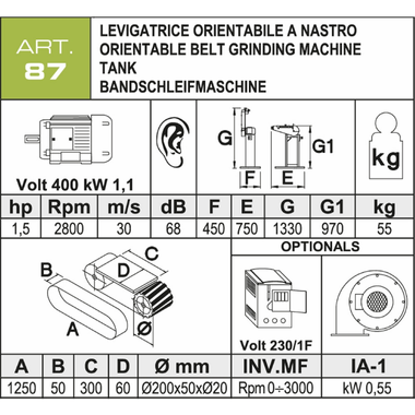 Levigatrice a nastro orientabile 1250x50 mm, 400 V, KW 1,1, 2800 giri/min.