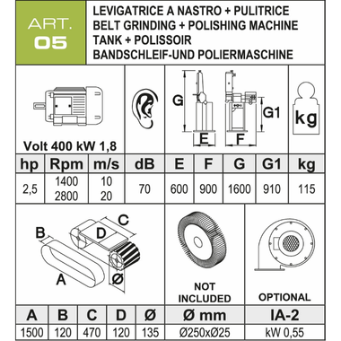 Levigatrice a nastro + pulitrice, 2,5 HP, 1,8 KW, 400 V, 2800 giri/min.