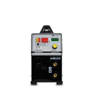 Eroga 250 Amp in corrente continua per saldare con elettrodi da 1,6 a 5,0 mm di diametro con un ciclo di lavoro elevato per la sua categoria. è indicata per le operazioni di saldatura di acciaio dolce, inox e alluminio.