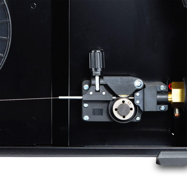 Dotazione: Torcia DE 15E – 180A 3m EURO (010822) (Ugello Ø 0,8 mm), rulli (Ø 0,8 / 1,0 mm Fe), cavo 16 mmq con morsetto di massa (2,7 m), tubo gas (1,5 m).